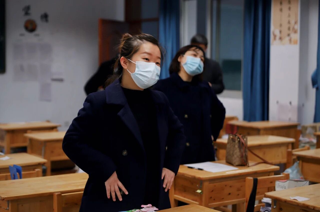 经消毒、测体温、登记无异常的同学,由老师引领保持安全距离,沿规定线路进入教室。教室是开展教学活动的重要场所,防控要求异常严格。学校对教室原有桌凳进行了调整,确保间距为1米以上,并提前进行了消毒和通风。在进入教室前,由班主任进行三检体温并作登记,体温正常、无咳嗽等症状的学生方可进入教室,对号间隔就坐,讲台距离第一排1米间距。班主任主持进行“开学第一课”,进一步对学生疫情防控知识培训、个人防护知识教育。在上课的过程中,老师发现了一名学生精神异常,通过询问和体温测量,发现有学生体温高于37.3°C,授课老师立即将学生情况进行上报,由学校防疫人员将该学生带至隔离室作进一步检测,班主任则将全体同学转移至备用教室(103),安抚学生情绪。消毒组对相关场所进行消毒。