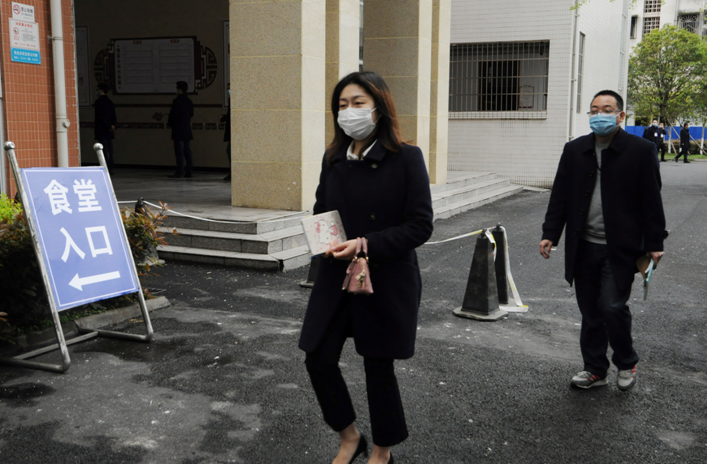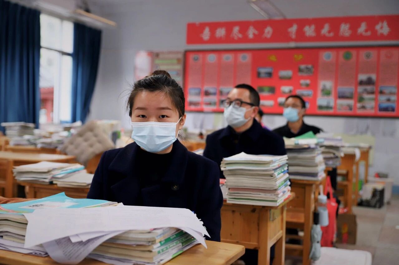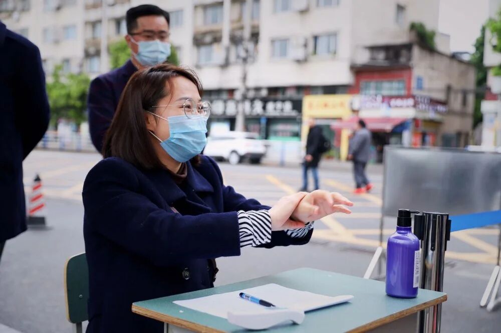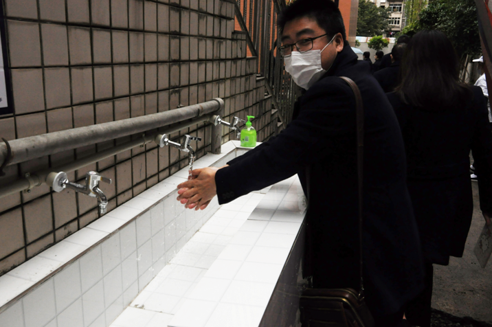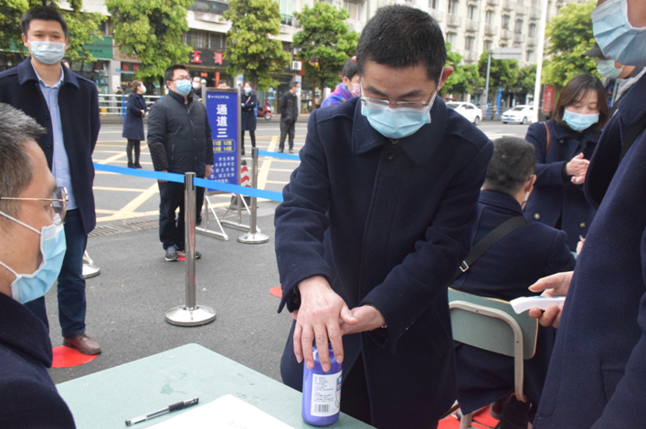 学校实行多通道分时错峰入学,所有学生佩戴口罩,在各班级规定的入学区域安静等候以1米以上的间隔排成两队,并在值班老师的指引下分批次、分通道有序通过大门防疫消毒区,检测人员仔细对所有入校人员进行体温检测和手部、鞋底消毒。