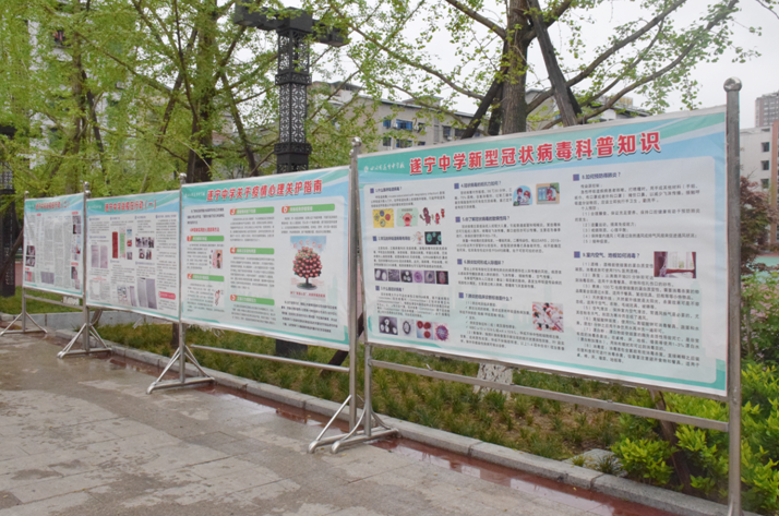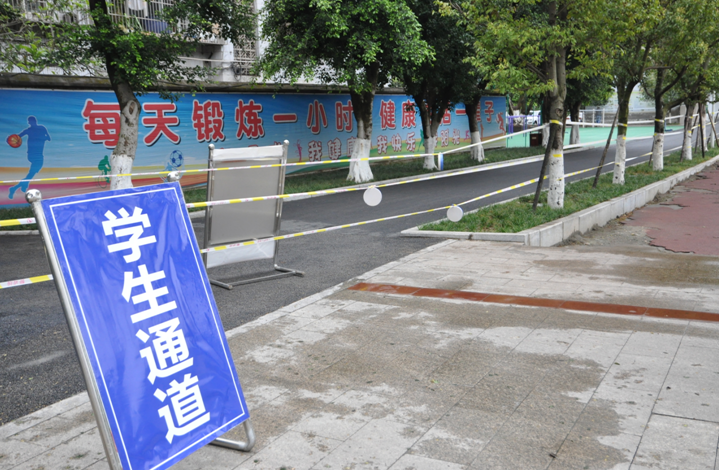 校园单独开辟出学生通道,并在主干道上摆放着疫情防控宣传展板,让学生随走随学。