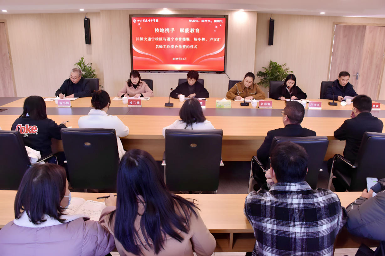 11月24日下午,四川师范大学遂宁校区与遂宁市曾德强、杨小辉、卢文汇名师工作室合作签署仪式在遂宁中学高新校区举行。四川师范大学遂宁校区综合管理委员会副主任谭英,市教师发展中心副主任余彩虹,遂宁中学党委委员、副校长杨兰萍等出席活动,三个市级名师工作室的领衔人、成员代表与学员代表共同参与见证。活动由遂宁中学教师发展中心主任卢文汇主持。