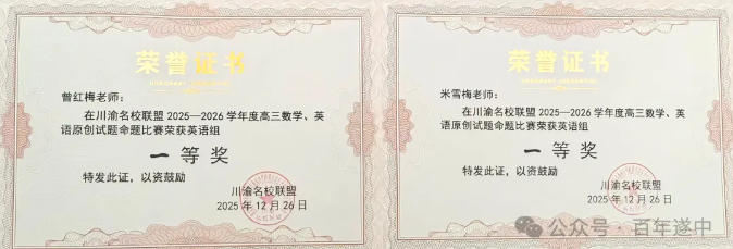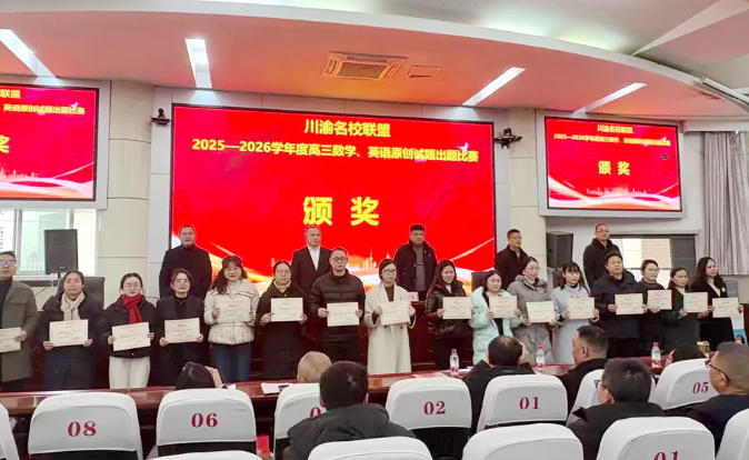 12月26日,川渝名校联盟2025—2026学年度高三数学、英语原创试题命题比赛在重庆市潼南中学校举行。遂宁中学数学组、英语组凭借出色的命题设计与扎实的学科素养,在激烈竞争中脱颖而出,双双荣获一等奖,展现了学校在学科教学与命题研究方面的扎实功底。