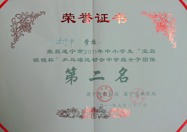 2011年7月荣获遂宁市2011年中小学乒乓球运动会中学组男子团体“第二名”