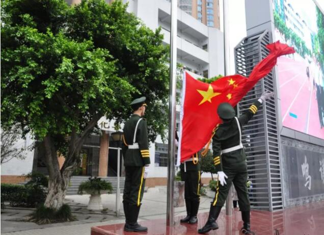 首先进行的是升旗仪式,旗手们队列齐整、精神饱满,怀着对祖国的无限热爱和对国旗的敬仰之情,登台升旗。伴着雄壮的国歌声,鲜红的五星红旗冉冉升起。