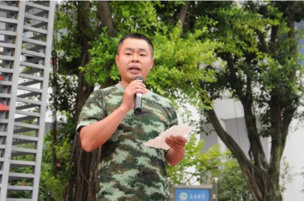 随后,教官代表上台发言,表示将耐心指导,从自我做起,认真履行教官应尽的职责,以身作则,让学生掌握一定的军事知识和技能,培养良好的生活作息习惯。