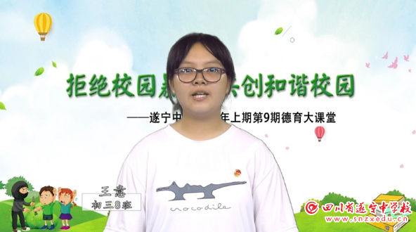 为了让全校师生共同筑起思想、行为和生命的安全长城,预防校园暴力,共创和谐校园,遂宁中学于2020年6月15日举行了第九期德育大课堂——拒绝校园暴力 共创和谐校园。本次活动由体卫艺术处主任严飞主持。