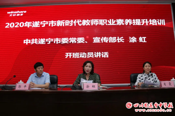 为全面提升教师思想政治素质和职业道德水平,造就党和人民满意的高素质专业化创新型教师队伍,促进教育高质量发展,7月21日,2020年遂宁市新时代教师职业素养提升培训会在遂宁中学鸣谦学术厅召开。市委常委、宣传部长涂虹出席开班仪式并讲话。市委教育工委书记、市教育体育局党组书记、局长肖霞,市委教育工委副书记、局党组成员陈杰等相关领导出席开班仪式。肖霞局长主持会议。