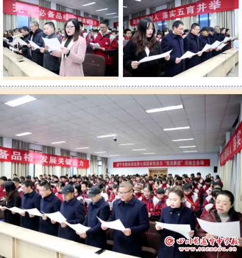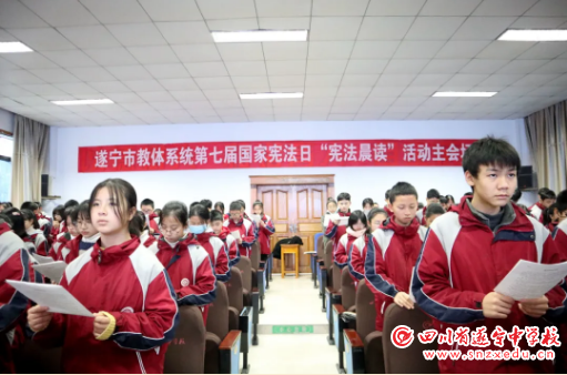 “本宪法以法律的形式确认了中国各族人民奋斗的成果,规定了国家的根本制度和根本任务,是国家的根本大法,具有最高的法律效力……”今年12月4日是第七个国家宪法日,在2020年遂宁市教体系统国家宪法日“宪法晨读”活动主会场——遂宁中学,与会人员在琅琅诵读声中深刻感受了宪法的庄严神圣。