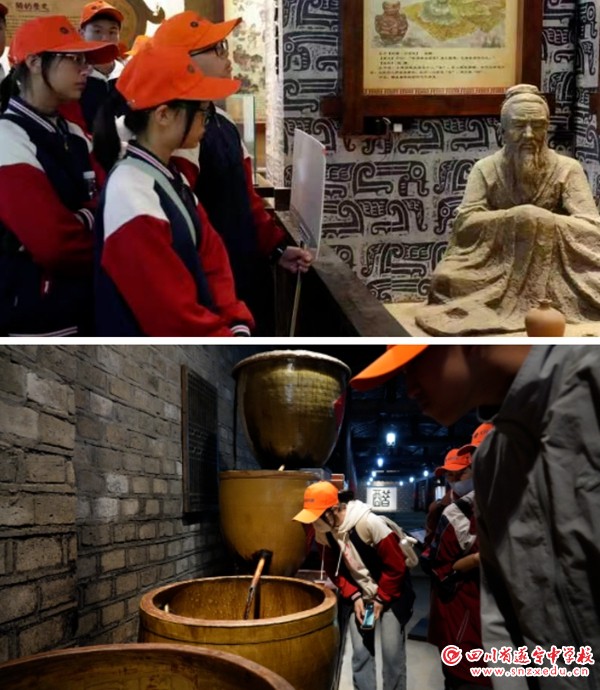 第二站,同学们走进阆中醋文化博览园,感受悠久酿醋历史,揭秘传统工匠技艺。保宁醋是四川省的地方传统名优特产,属于中国四大名醋之一。在这里,同学们了解古代建筑房梁的构造,聆听醋神姜子牙的故事,观赏历代生产酿造醋的工具文物,知晓制醋的各个流程,并亲自体验酿醋的道道工序。此行不仅增长了同学们的见识,还使其领略到阆中独特的风土人情,体会源远流长的中国醋文化。