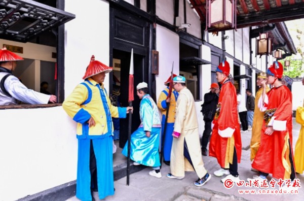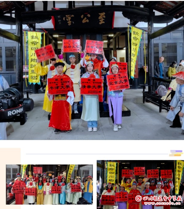 阆中重学兴教,文脉鼎盛,文运昌达,先后诞生众多状元、进士,被誉为“科举状元之乡”。同学们接着走进贡院,参观科举时代士子们的应试考场,了解科举制度的发展历程,他们还乔装一变,穿起科举服,体验起旧时的科举考试,感受中举后的喜悦。