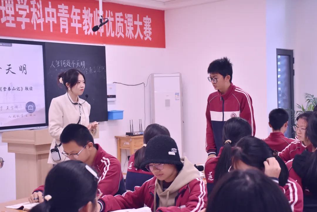 在语文课堂上,四位教师紧扣“山水悟道”的单元主题,对《赤壁赋》与《登泰山记》进行了整合教学。老师们或通过苏东坡与姚鼐的时空对话,引导学生对比赏析二者在面对自然浩渺时的不同心境与人生哲思;或借助多媒体手段再现赤壁秋江与泰山日出的壮美意境,使学生在沉浸式体验中感受文本的意境之美与情感之真。课堂上,教师们普遍注重文本细读与思辨能力培养,引导学生从语言文字中品味文学魅力,探究深层内涵。教学环节设计环环相扣,有效提升了学生的审美鉴赏能力,充分体现了新课标理念下的大单元教学特色,实现了知识传授与价值引领的有机统一。