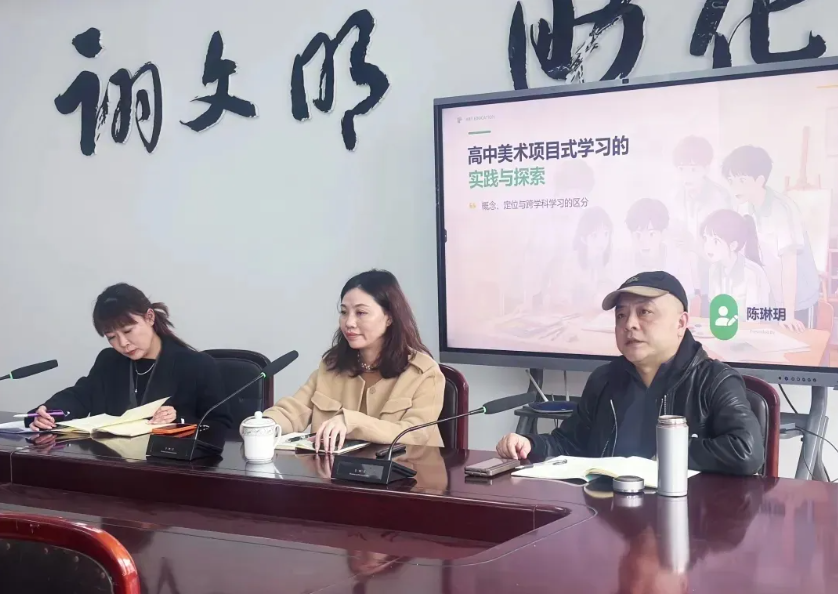 美术学科教研中,市教科所美育中心主任陈琳玥作《高中美术项目式学习的实践与探索》专题培训,推动项目式大单元教学在美术学科中深化发展。谢明老师围绕美术学科素养、课堂教学规范及团队协作三大维度,强调教师要坚守寓教于乐的美育使命。