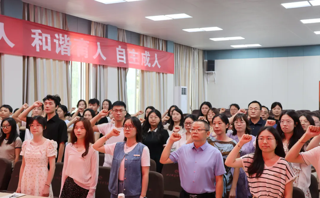 校领导为新入职教师授予校徽,标志着他们正式成为遂宁中学大家庭的一员。授校徽仪式结束后,在晏永乐老师的带领下,全体新入职教师庄严宣誓:"我志愿成为一名人民教师,忠诚党的教育事业,履行教师神圣职责……"誓言回荡,使命在肩。