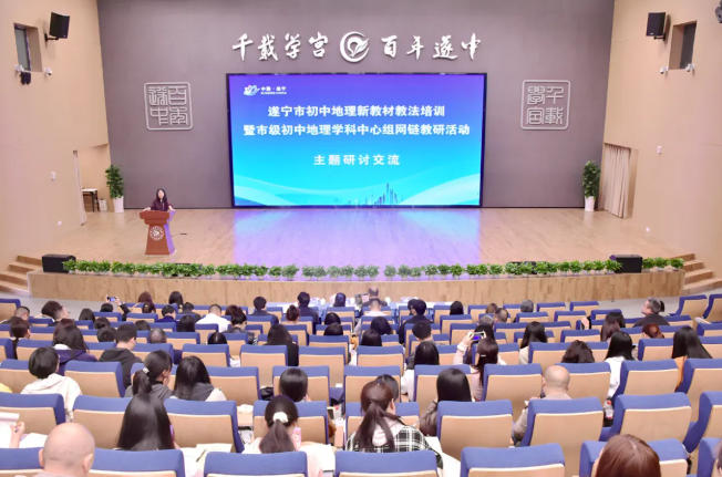 为深入推进《义务教育地理课程标准》修订要求的落地实施,深化课堂教学改革,4月13日,由遂宁市教育科学研究所主办、遂宁中学承办的遂宁市初中地理新教材教法培训暨市级初中地理学科中心组网链教研活动在遂宁中学高新校区鸣谦学术交流中心举行。全市各县(市、区)初中地理教研员、遂宁市卢文汇名教师工作室成员、遂宁市初中地理学科中心组全体成员及各县(市、区)骨干教师代表齐聚一堂,共研教学新路径。