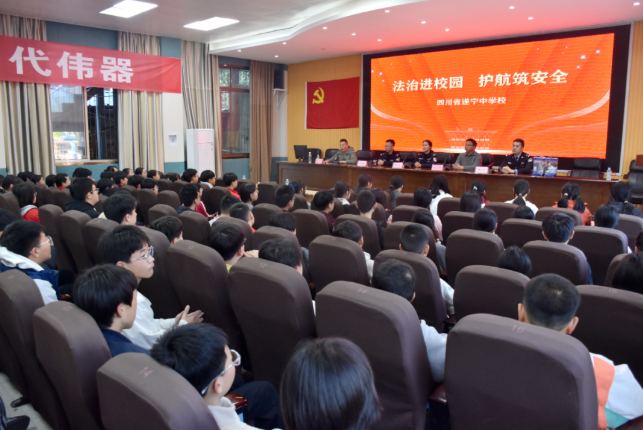 春风送暖,法润校园。3月11日,遂宁中学育才校区举行“法治进校园,护航筑安全”学生安全教育主题讲座。遂宁市公安局政治部宣传处副处长、育才校区法治副校长贺琪,遂宁中学杨小辉主任,市公安局政治部宣传处一级警长、育才校区法制辅导员刘永新等出席活动。此次讲座由蓬溪县公安局普安派出所所长、一级警长、蓬溪“书乡守未”未成年人保护工作站负责人梅伊主讲,育才校区各年级师生代表到场聆听。
